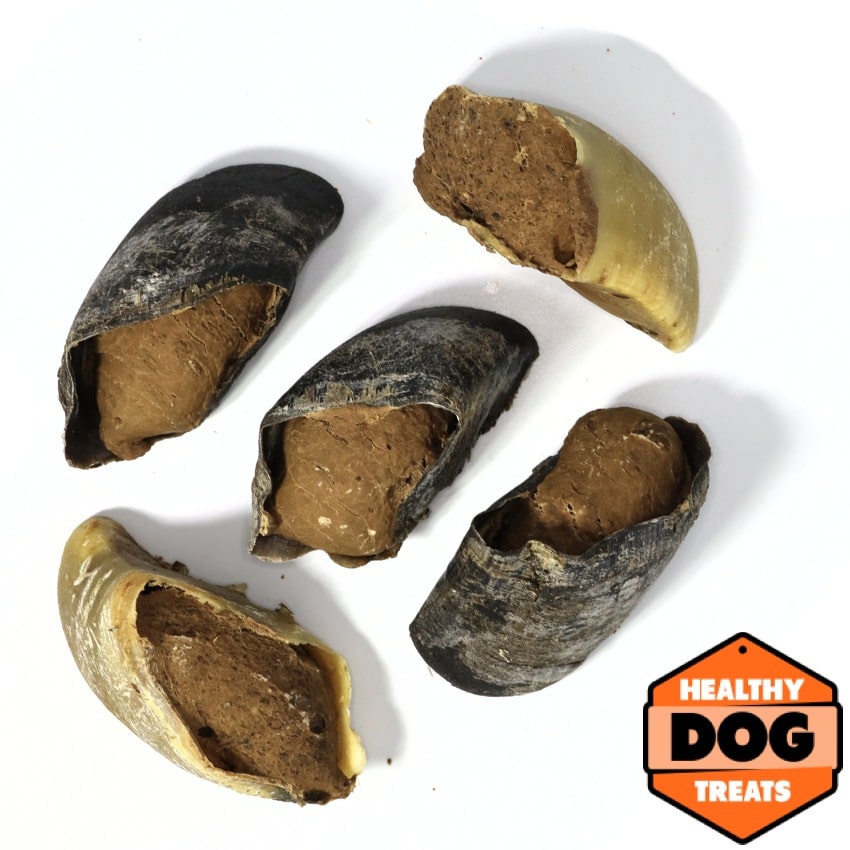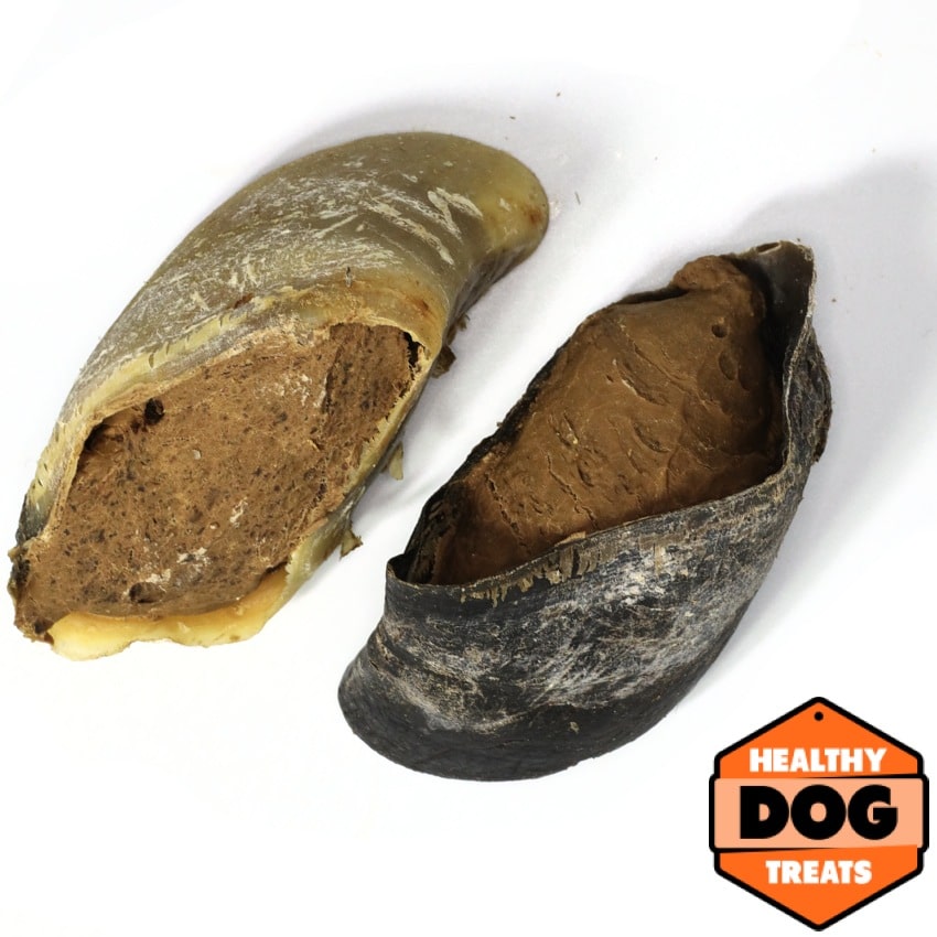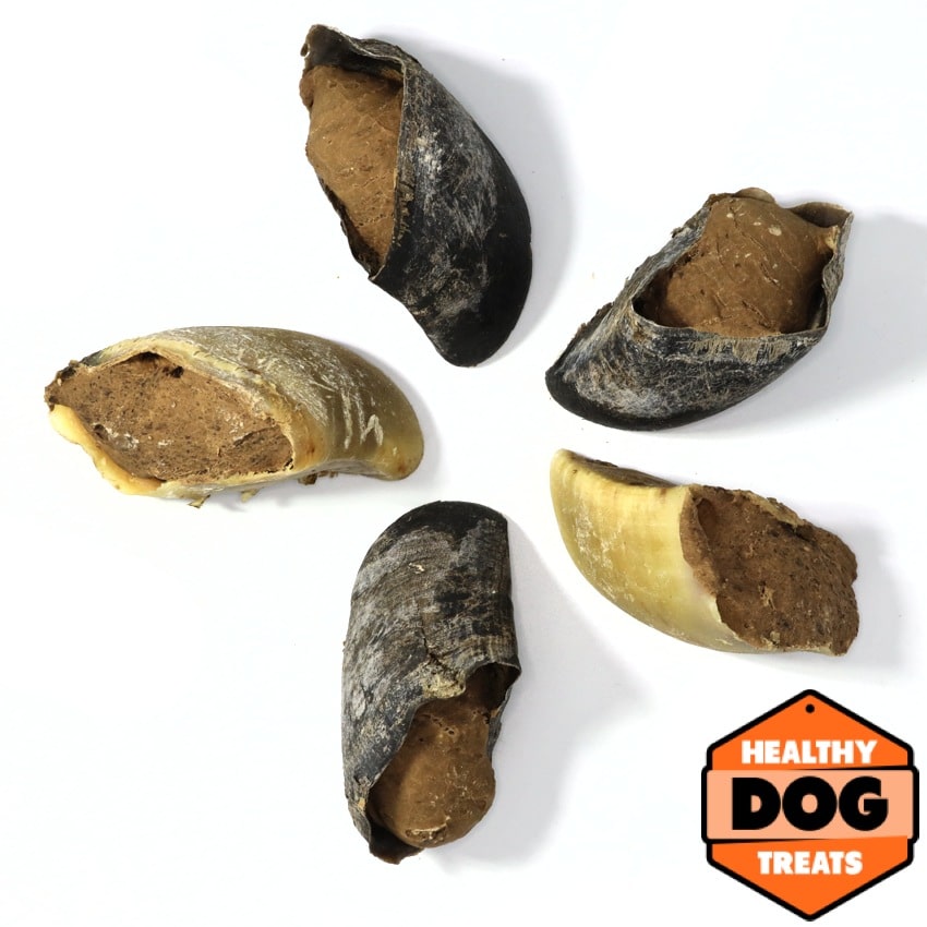 The stuffed hooves currently come in three meat stuffing varieties: Beef, Kangaroo and Chicken … choose your dog’s favourite or mix and match to keep them interested.