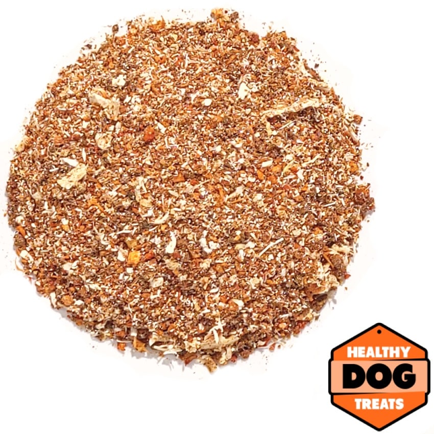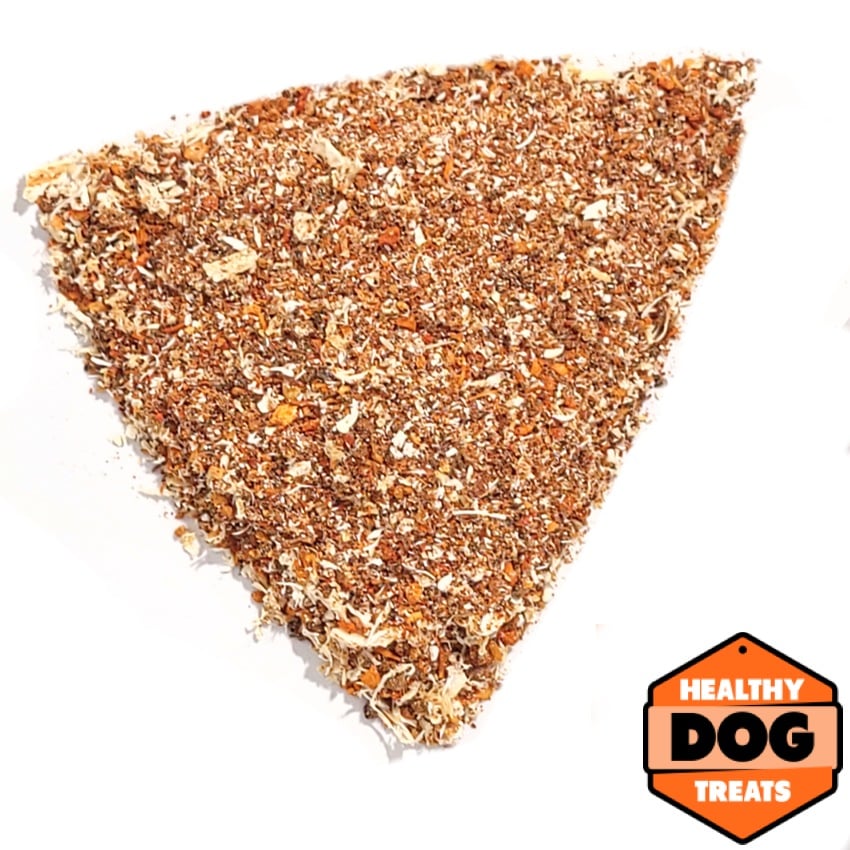 TEXTURE: It turns out that many dogs don’t fancy a simple highly refined powder as a topper. There is no crunch to it, no texture. Essentially nothing to get their teeth into. You will also find that most driers charge a premium for the extra time and effort it takes to grind anything down to a super fine powder. So it kind of makes sense to provide exceptional taste, nutrition and medicinal functions at the most affordable price, that you allow some of the original whole treats to be slightly visible among the powder.