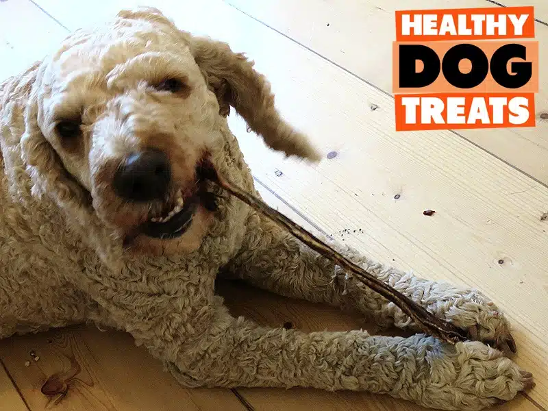 Archie dog eating roo jerky from Healthy Dog Treats